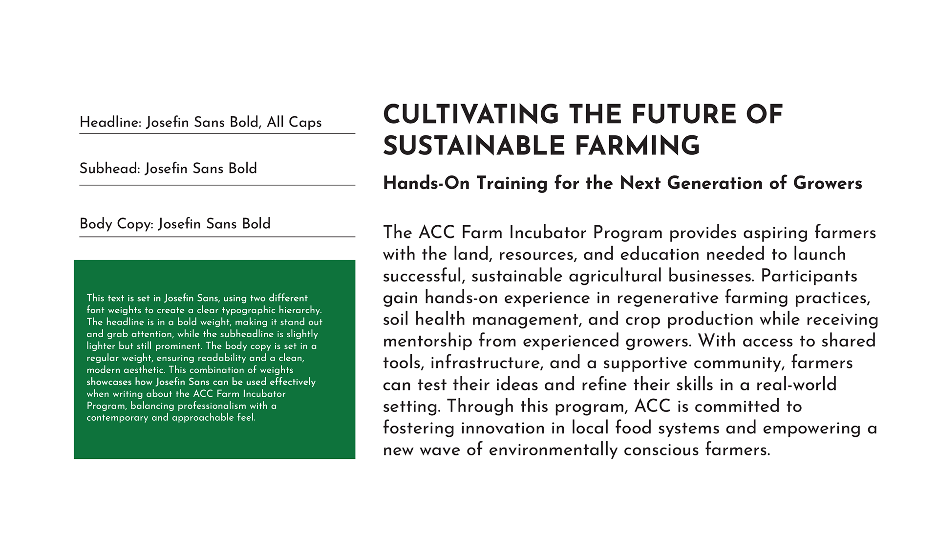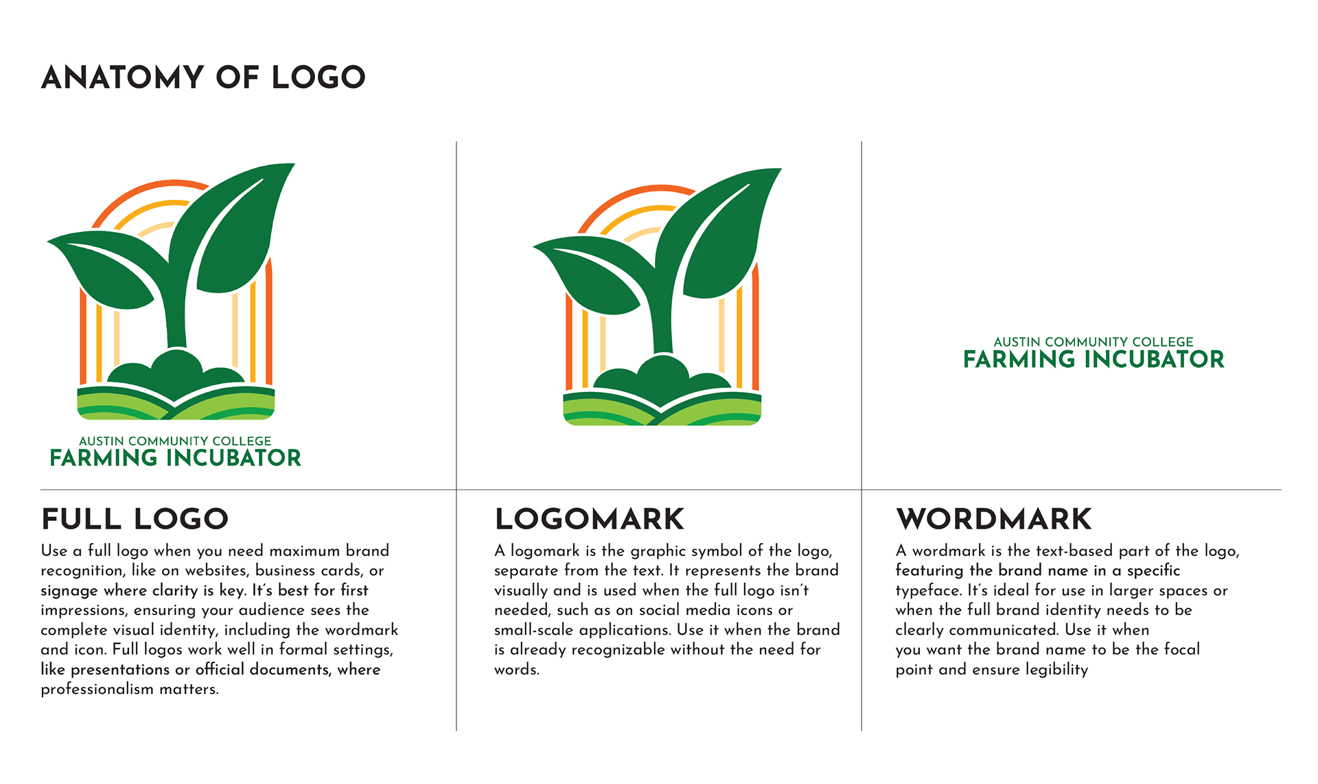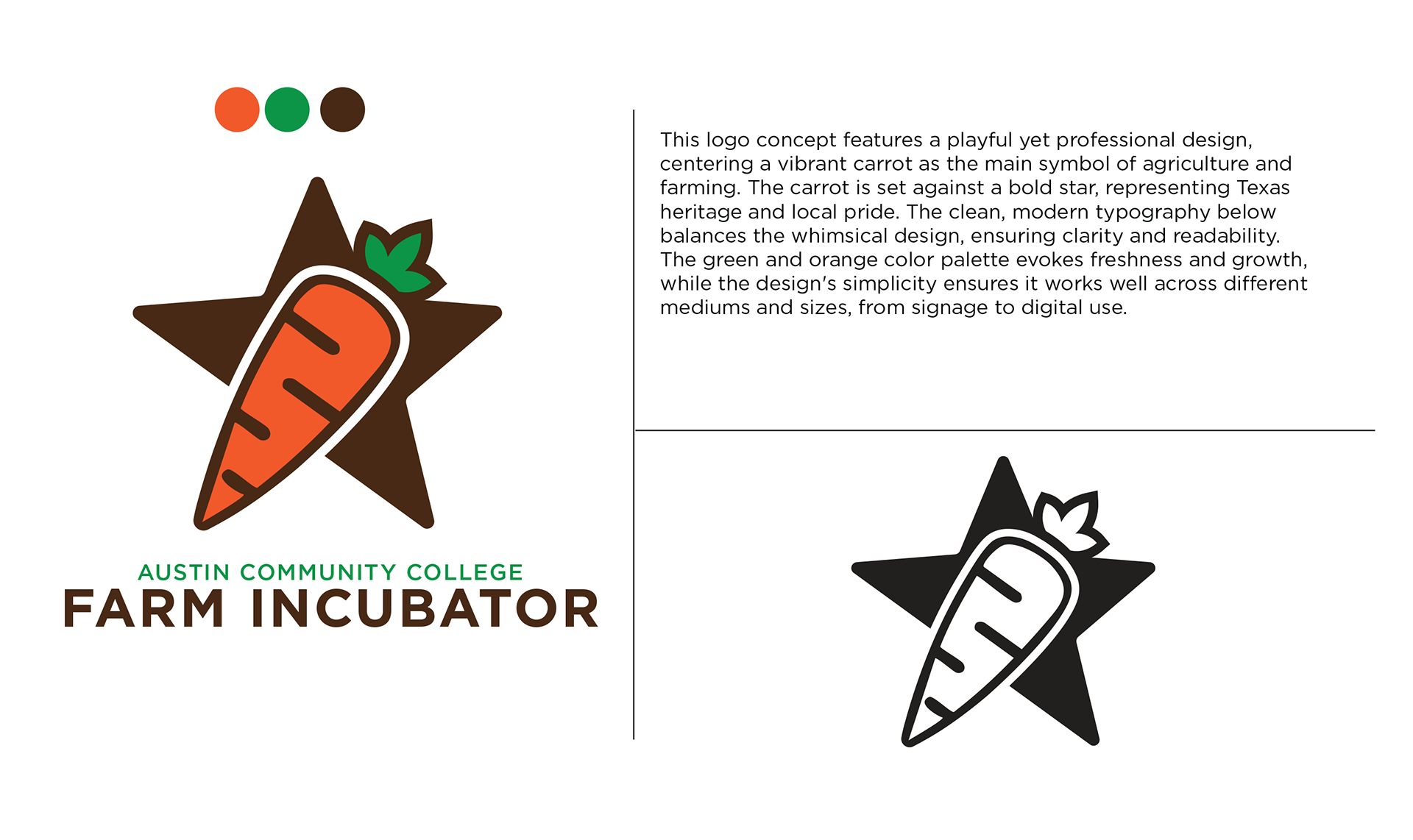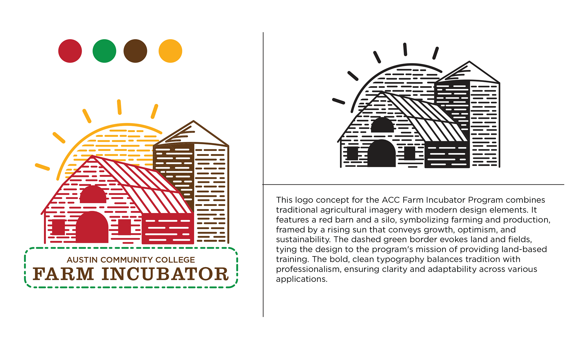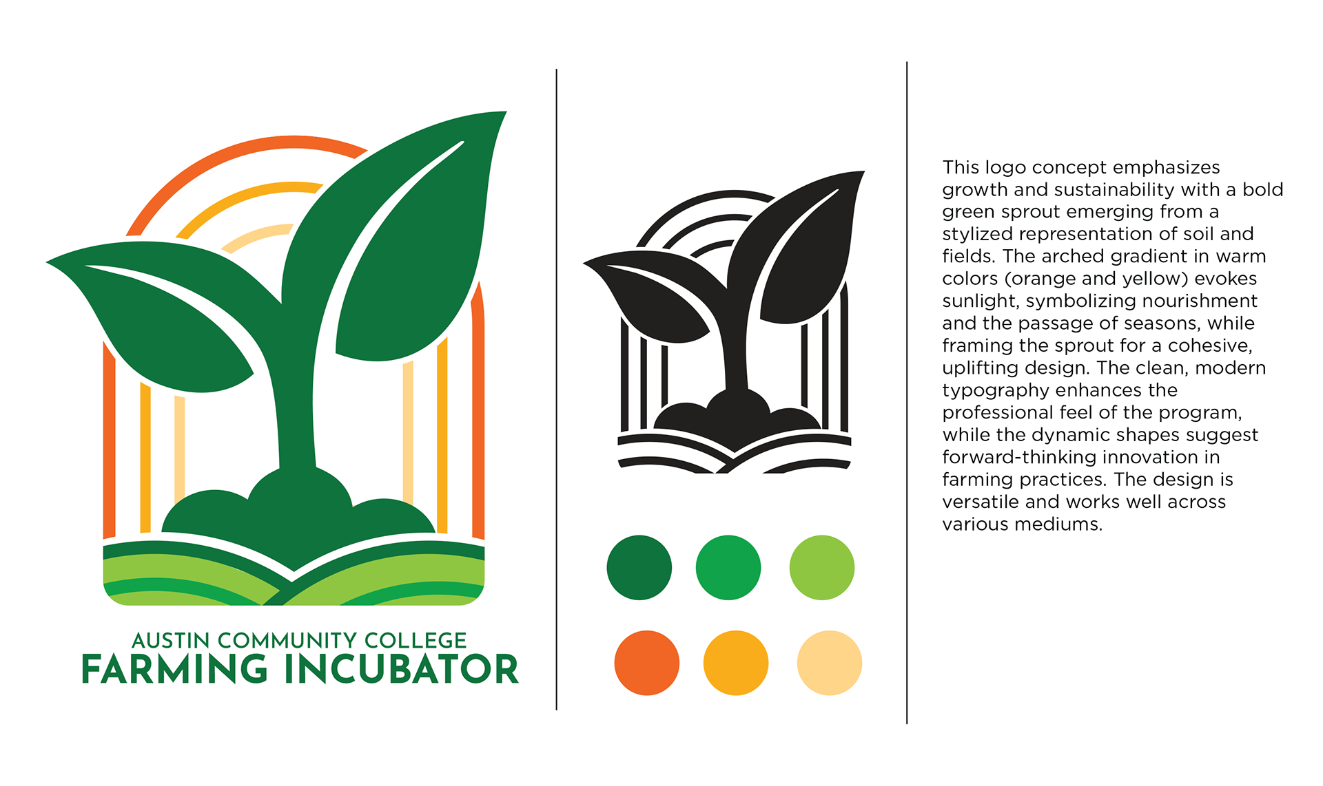 The Austin Community College Farm Incubator Program supports a new wave of environmentally conscious growers by providing education, land, and resources. The visual identity was designed to be both modern and approachable, successfully merging symbols of academic structure and regenerative farming into a cohesive brand system that clearly communicates the program's dual focus on learning and growth.