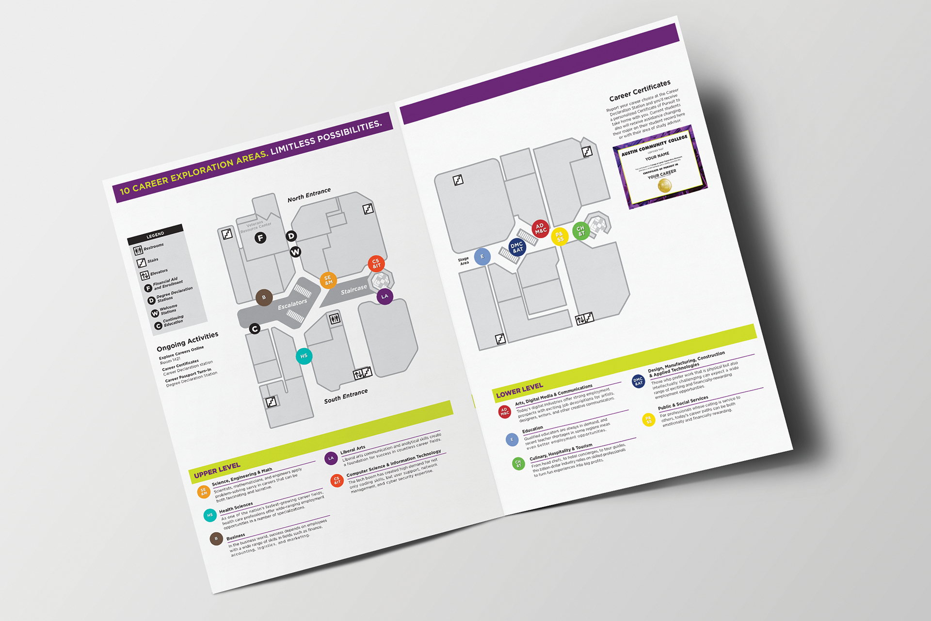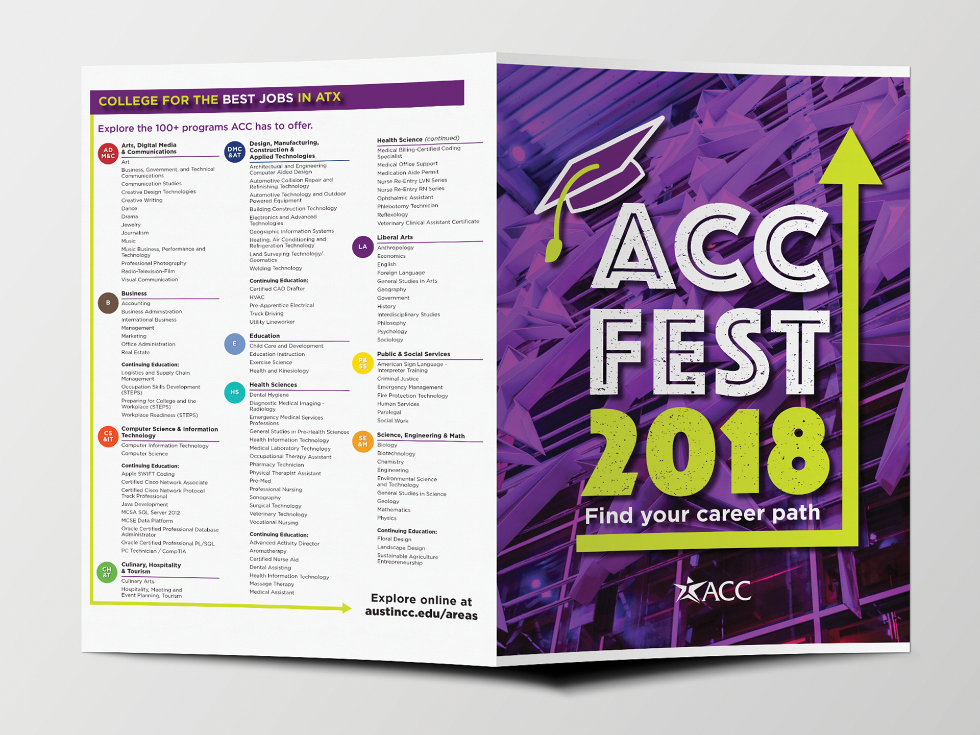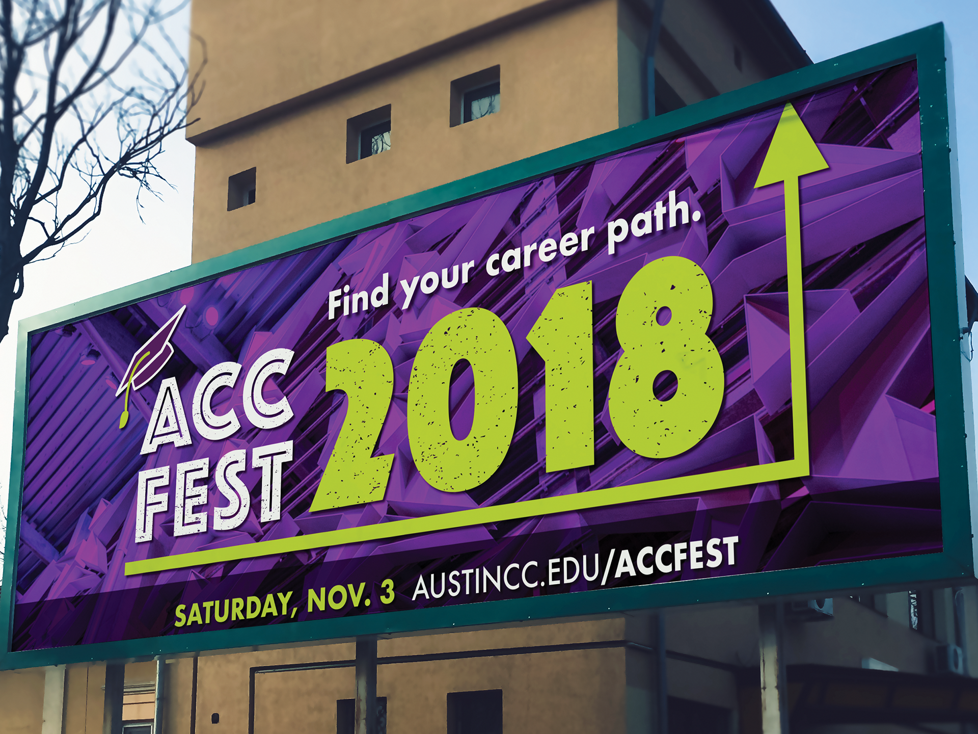 I led the branding, wayfinding, and environmental design for ACC Fest 2018, a major career exploration festival designed to showcase the college's diverse areas of study and programs. The goal was to transform the campus into an intuitive and exciting environment, supporting over 1,000 students from across Central Texas as they navigated live demonstrations and interacted with faculty. This large-scale design effort was critical in creating a memorable, cohesive, and easily navigable experience for attendees, ensuring maximum engagement and successful exploration of ACC's educational offerings.