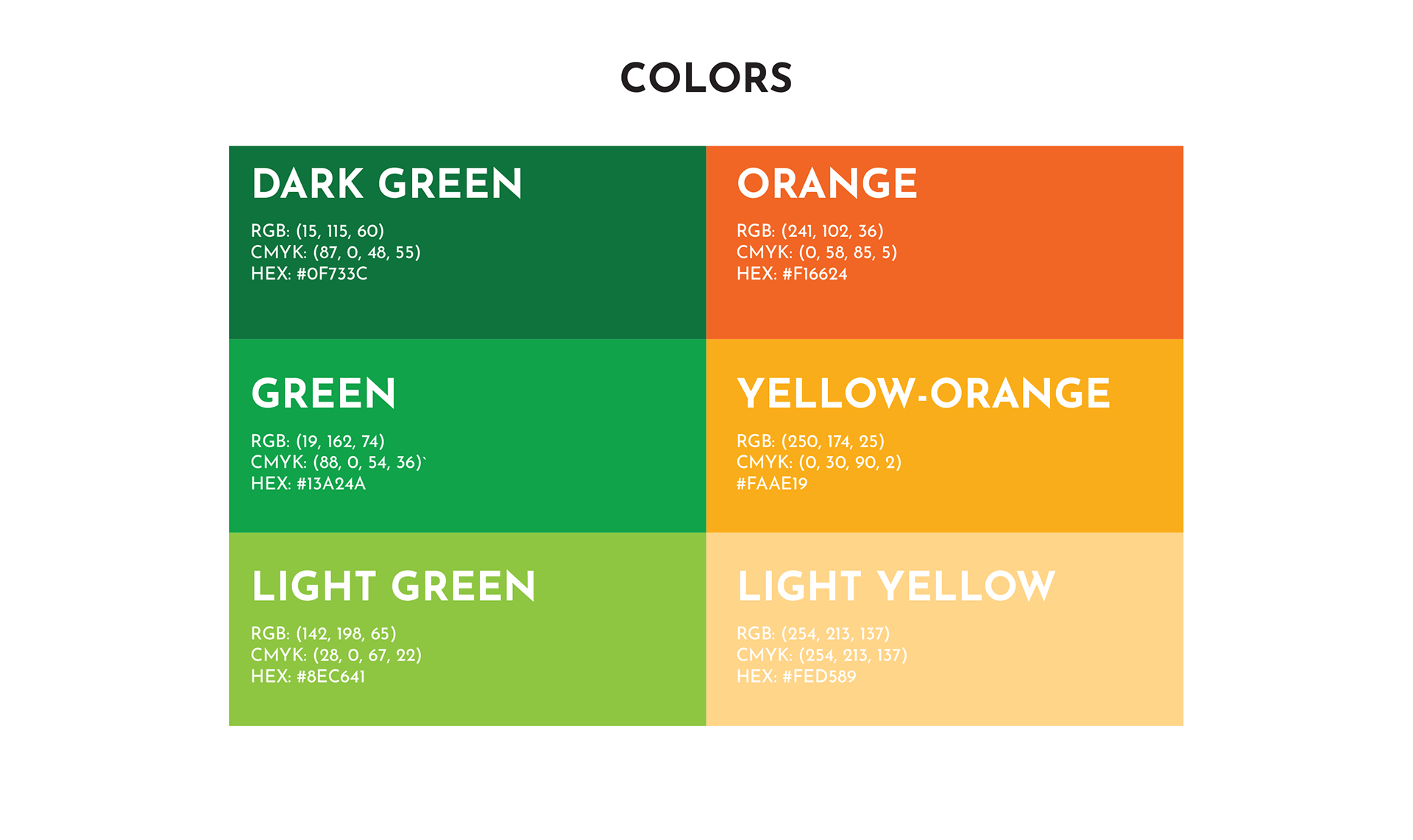 Defined Color Palette: The core identity is built on a spectrum of greens and orange, directly tying the visual aesthetic to the program’s mission of regeneration and harvest. All color codes (RGB/CMYK/HEX) were defined to guarantee consistency from digital screens to print collateral.