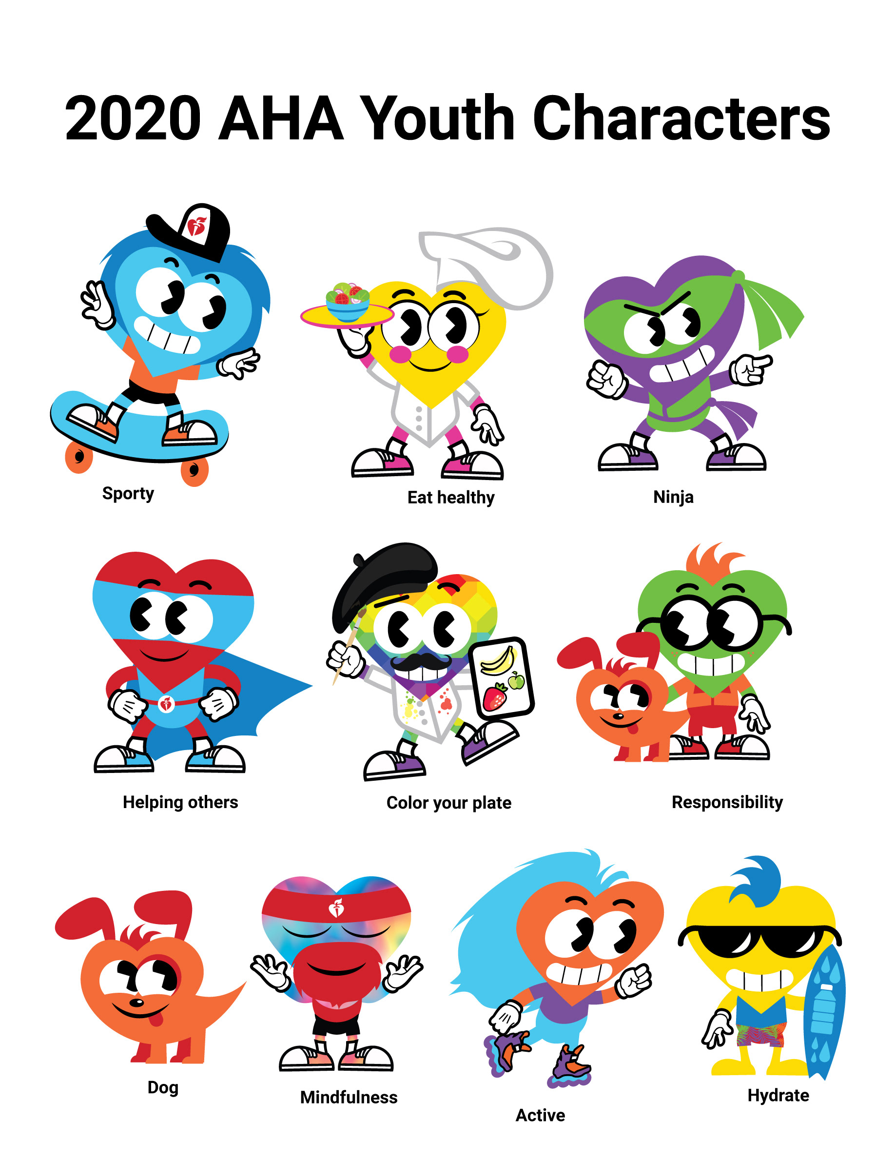 I designed the final character set for the American Heart Association's Kids Heart Challenge campaign. My original character designs and comprehensive art direction served as the foundational style guide for a dedicated team of animators. The team then took my static designs and brought them to life across various animated digital assets and videos, successfully translating the established visual style, personality, and energetic tone of the characters into dynamic motion graphics to promote the national program.