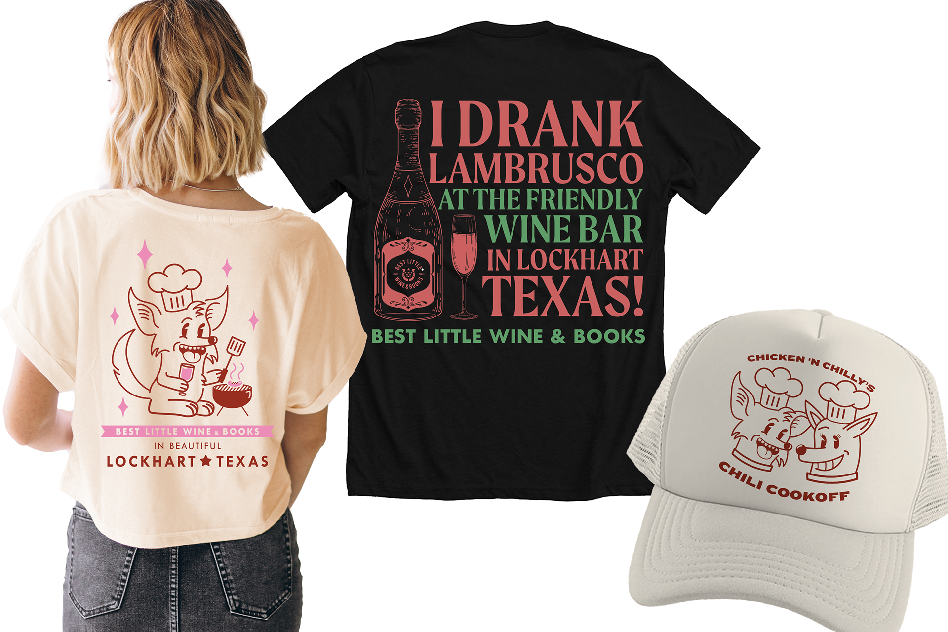 I developed the illustrated branding and event identities for Best Little Wine & Books in Lockhart, Texas. The project focused on creating high-energy, character-driven designs for key community milestones, including the inaugural Texas Monthly BBQ Fest, Lambrusco Fest, and the Chicken ‘n Chilly’s Chili Cookoff. These assets were applied across a diverse range of deliverables, including promotional posters, limited-edition apparel, and specialty merchandise.