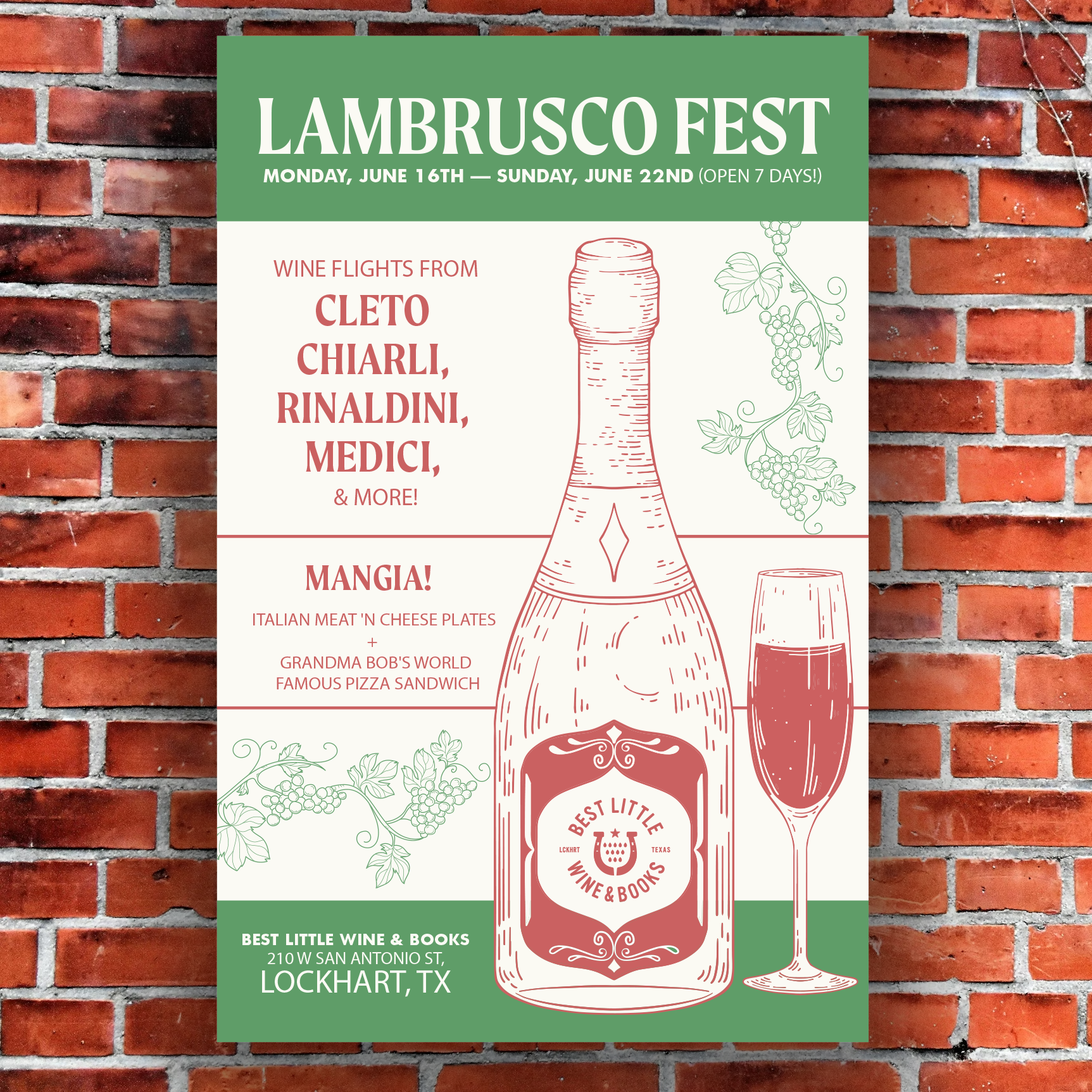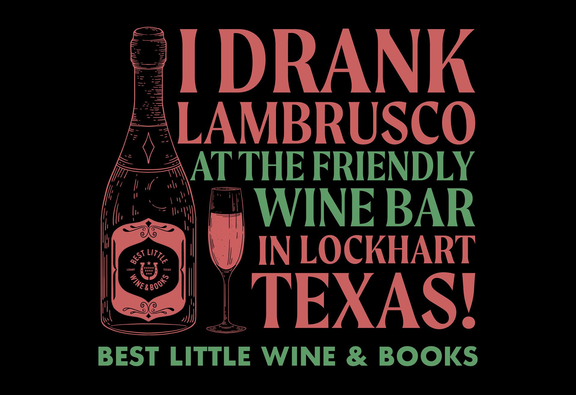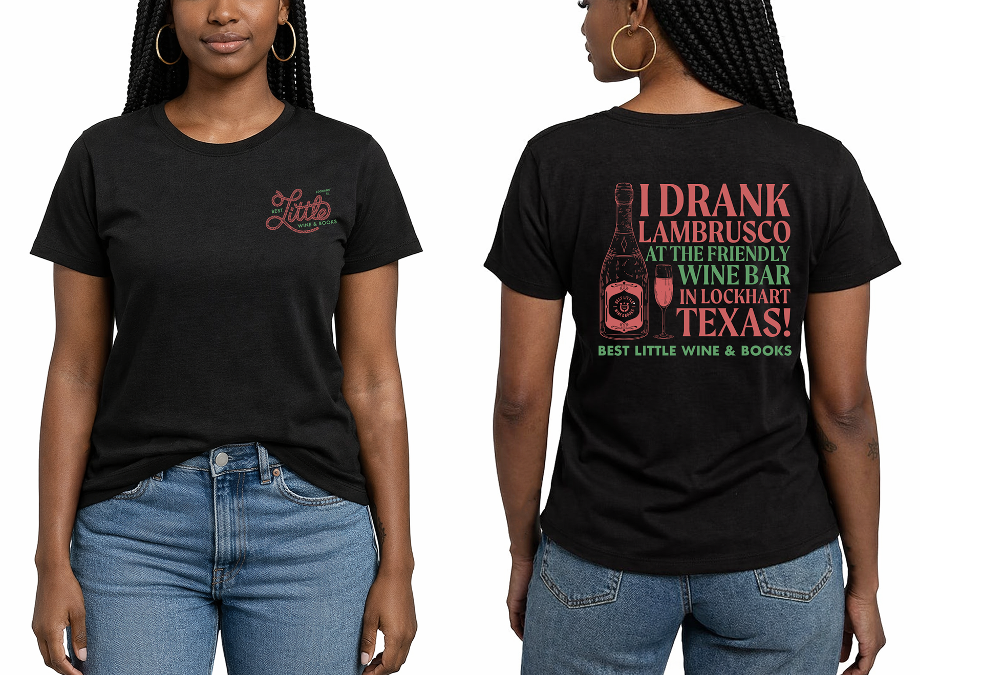 I developed the event branding for a week-long celebration of Italian sparkling red wine at Best Little Wine & Books. This project included a promotional poster featuring custom line art of a Lambrusco bottle and a souvenir t-shirt designed with a bold, retro-style typographic layout.